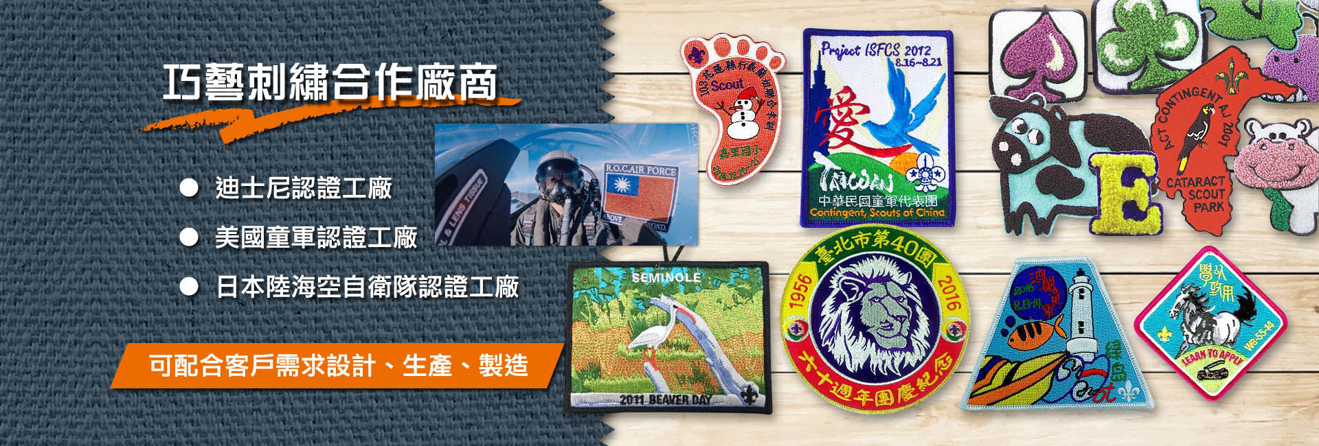 『巧艺刺绣』长期以来,与许多厂商保持良好合作关係,许多需要刺绣的相关厂商不计期数,指定巧艺为合作厂商(日本迪士尼认证工厂、美国童军认证工厂、日本陆海空自卫队认证工厂)。因此巧艺的产品,绝对可以完全配合客户商家之设计,由于精熟的技术,为您量制达到市场要求之水准,品质保证深得人心。